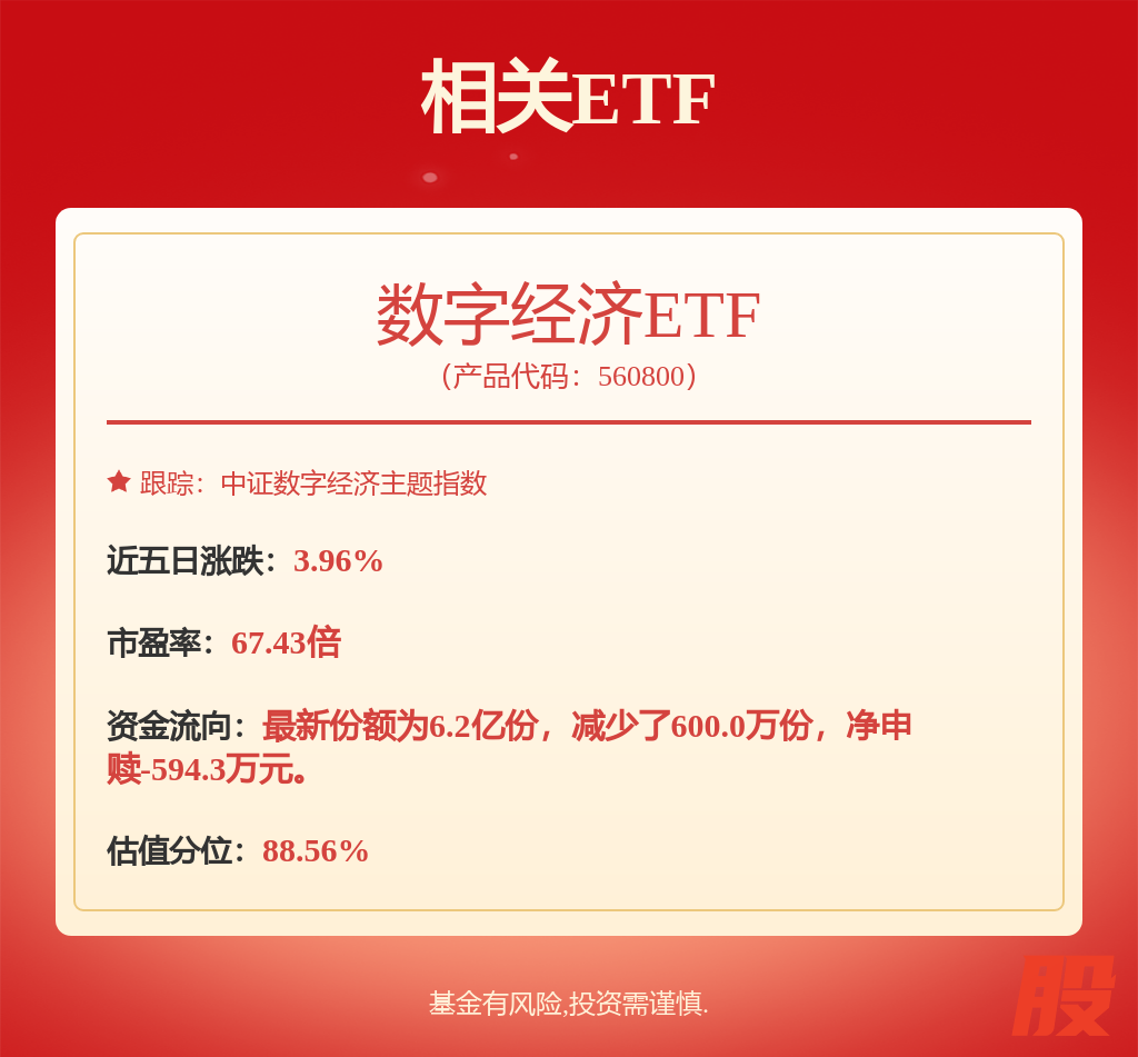 风险提示,中证数字经济主题指数(931582)由中证指数有限公司(“中证”)编制和计算,其所有权归属中证及/或其指定的第三方。中证对于标的指数的实时性、准确性、完整性和特殊目的的适用性不作任何明示或暗示的担保,不因标的指数的任何延迟、缺失或错误对任何人承担责任(无论是否存在过失)。中证对于跟踪标的指数的产品不作任何担保、背书、销售或推广,中证不承担与此相关的任何责任。本基金为被动投资的交易型开放式指数基金,主要采用完全复制策略,跟踪标的指数市场表现,具有与标的指数所表征的市场相似的风险收益特征。投资者投资于本基金面临标的指数回报与相应市场平均回报偏离、标的指数波动、跟踪误差控制未达约定目标、标的指数变更、指数编制机构停止服务、成份股停牌或退市等潜在风险。本产品由鹏扬基金管理有限公司发行与管理,销售机构不承担产品的投资、兑付责任。基金管理人承诺以诚实信用、勤勉尽责的原则管理和运用基金资产,但不保证基金一定盈利,也不保证最低收益。基金的过往业绩并不预示其未来表现,本公司管理的其他基金的业绩并不构成对本基金业绩表现的预示和保证。投资者在投资基金前应认真阅读基金合同、招募说明书和基金产品资料概要等基金法律文件,全面认识基金产品的风险收益特征,在了解产品情况及销售机构适当性意见的基础上,根据自身的风险承受能力、投资期限和投资目标,对基金投资作出独立决策,选择合适的基金产品。